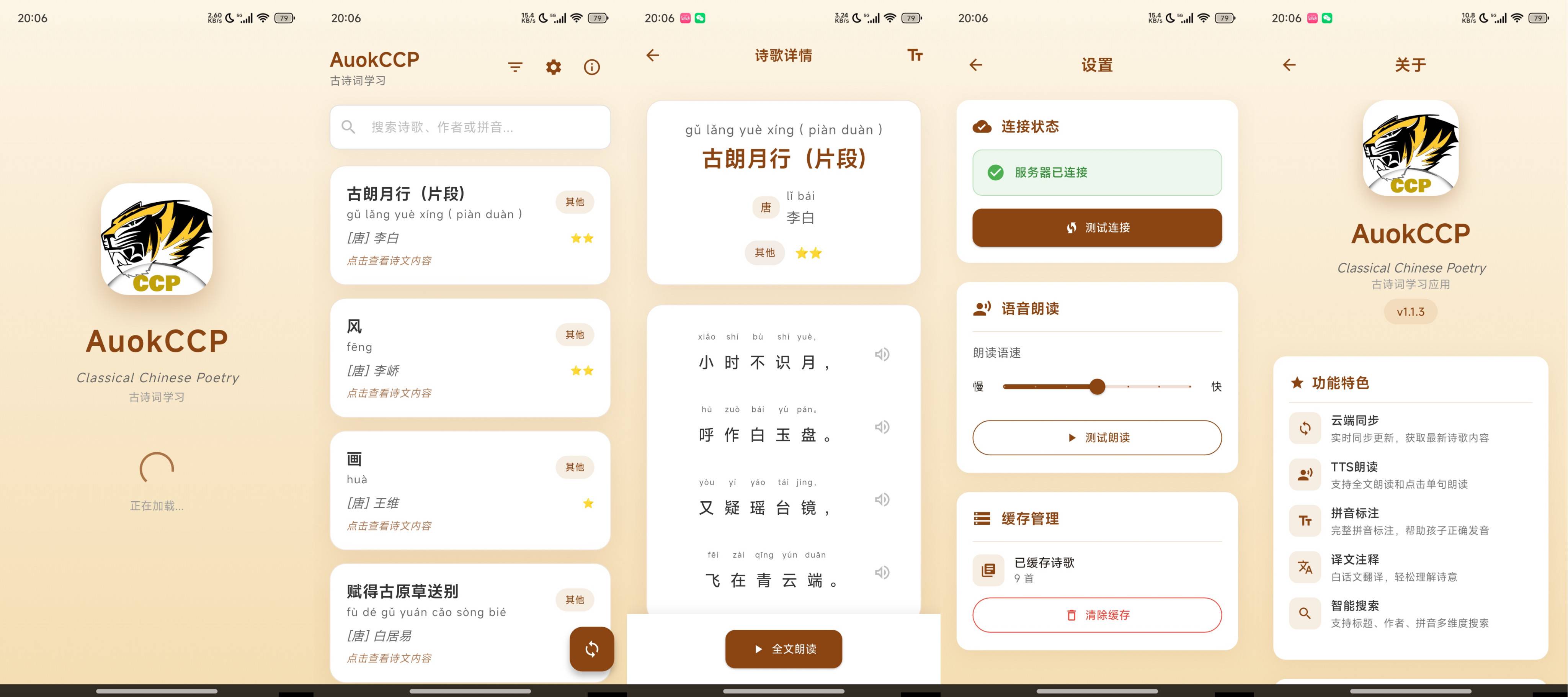 AuokCCP(Classical Chinese Poetry)是一款专注于古诗词学习的移动应用,结合了现代化的界面设计和传统文化内容,为用户提供优雅的诗词阅读和学习体验。